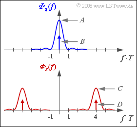 • Die Faltung  ${\it Φ}_q(f) ∗ {\it Φ}_z(f)$  ergibt das Leistungsdichtespektrum  ${\it Φ}_s(f)$  des Sendesignals.  Daraus folgt: