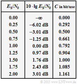 Durch die Tabelle vorgegeben ist der Kurvenverlauf der Kanalkapazität in Abhängigkeit von  $E_{\rm S}/N_0$.  Im Mittelpunkt dieser Aufgabe steht die numerische Auswertung der zweiten Gleichung.