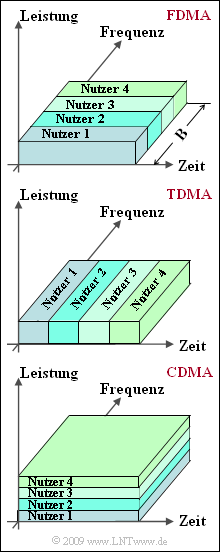 - Es liegt somit stets auch eine FDMA–Komponente vor. In jedem der 5 MHz–Bänder wird zudem CDMA eingesetzt, so dass in jedem Frequenzband gleichzeitig bis zu 512 Teilnehmer aktiv sein können.