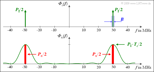 - $${\it \Phi}_{n}(f) = {\it \Phi}_{i}(f) \star {\it \Phi}_{c}(f) = \frac{P_{\rm I}\cdot T_c}{2}\cdot {\rm si}^2 \left( \pi \cdot (f - f_{\rm T}) \cdot T_c \right )+ \frac{P_{\rm I}\cdot T_c}{2}\cdot {\rm si}^2 \left( \pi \cdot (f + f_{\rm T}) \cdot T_c \right ) \hspace{0.05cm}.$$