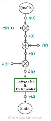 - Beim Empfänger wird wieder die gleiche Spreizfolge $c(t)$ phasensynchron zugesetzt.