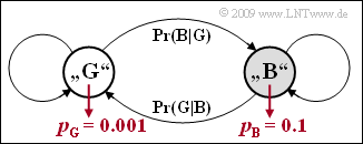 Die Fehlerwahrscheinlichkeit im Zustand „GOOD” betrage $p_{\rm G} = 0.1\%$. Für den Zustand „BAD” gelte $p_{\rm B} = 10\%$.
