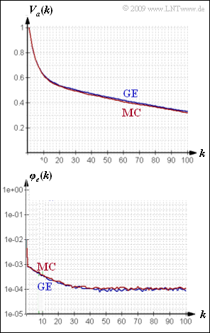 Die obere Grafik zeigt die aus  $N = 10^6$  Folgenelementen simulativ ermittelten Funktionen  $V_a(k)$  und  $\varphi_e(k)$  für das GE– und das MC–Modell. Hier ergeben sich noch leichte Abweichungen. Im Grenzfall für  $N → ∞$  stimmen dagegen Fehlerkorrelationsfunktion und Fehlerabstandsverteilung beider Modelle exakt überein.