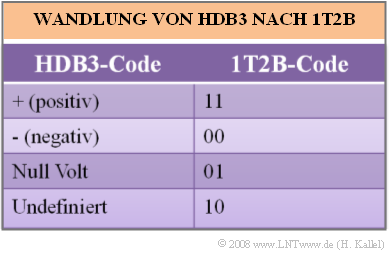 • Diese Umwandlung erfolgt redundant mit dem  1T2B–Code. Das heißt:  Jedes Ternärsymbol wird durch zwei Binärsymbole gemäß der angegebenen Tabelle dargestellt. Die Coderedundanz ist hierbei gleich  $1 – \log_2 \hspace{0.05cm} (3)/2 ≈ 20.7\%$.