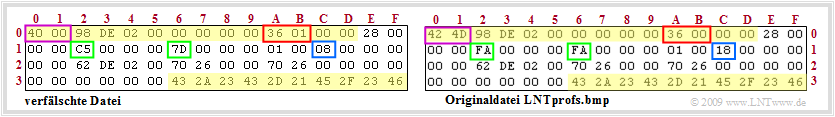 - Durch Korrektur des roten Fehlerblocks im Bereich 0x0A ... 0x0D (Offset) von „0x 36 01” in „0x 36 00” erhält man schließlich das Originalbild „LNTprofs.bmp”.