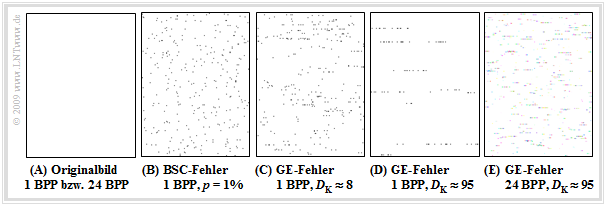 Die folgende Bilderserie zeigt den Einfluss von statistisch unabhängigen Fehlern (BSC–Modell) mit folgenden (Bit–)Fehlerwahrscheinlichkeiten: