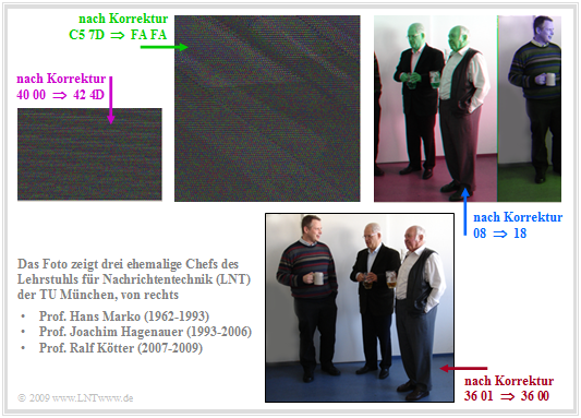 Hinweis: Alle (verfälschten) BMP–Bilder und WAV–Audios zu diesem Kapitel wurden mit dem Windows–Programm „Digitale Kanalmodelle & Multimedia” aus dem (früheren) Praktikum „Simulation Digitaler Übertragungssysteme ” am Lehrstuhl für Nachrichtentechnik der TU München erzeugt. Die folgenden Links stellen bereit: