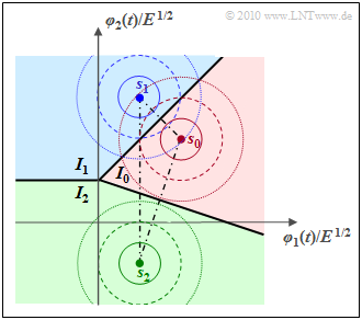 etwas genauer, wobei wir wieder von zwei Basisfunktionen $(N = 2)$ und den drei Signalraumpunkten $\boldsymbol{ s }_0$, $\boldsymbol{ s }_1$ und $\boldsymbol{ s }_2$ $(M = 3)$ ausgehen.