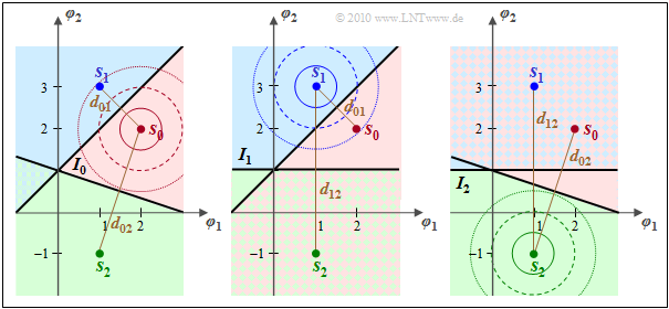- Bei gleichwahrscheinlichen Symbolen ⇒ ${\rm Pr}( m_0) = {\rm Pr}( m_1) ={\rm Pr}( m_2) = 1/3 $ verlaufen die Grenzen zwischen jeweils zwei Regionen stets geradlinig, mittig und rechtwinklig zu den Verbindungsgeraden.