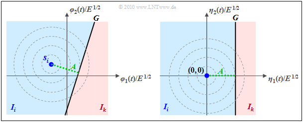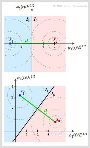 - Bei gleichwahrscheinlichen Symbolen verläuft die Grenze genau in der Mitte zwischen $\boldsymbol{ s }_0$ und $\boldsymbol{ s }_1$ und um $90^\circ$ verdreht gegenüber der Verbindungslinie zwischen diesen Sendepunkten (linke Grafik):
