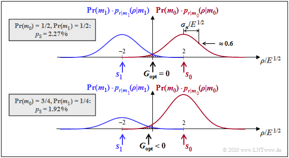 - Bei gleichwahrscheinlichen Symbolen ⇒ ${\rm Pr}( m_0) = {\rm Pr}( m_1)$ ergibt sich die optimale Entscheidungsgrenze zu $G_{\rm opt} = 0$ (siehe obere Skizze). Damit erhält man für die Fehlerwahrscheinlichkeit: