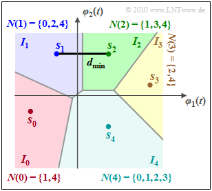 - \[{\rm Pr}({ \cal E}\hspace{0.05cm}|\hspace{0.05cm} m_i ) = \sum\limits_{k = 0, \hspace{0.1cm} k \ne i}^{M-1}{\rm Q}\big [ d_{ik}/(2{\sigma_n}) \big ] \hspace{0.2cm} \Rightarrow \hspace{0.2cm} {\rm Pr}({ \cal E}\hspace{0.05cm}|\hspace{0.05cm} m_i ) = \sum\limits_{k = 0, \hspace{0.1cm} k \hspace{0.05cm}\in \hspace{0.05cm}N(i)}^{M-1}\hspace{-0.4cm}{\rm Q} \big [ d_{ik}/(2{\sigma_n}) \big ] \hspace{0.05cm}. \]