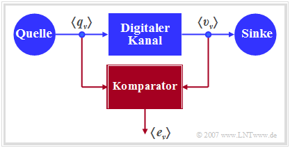 Dagegen muss zur messtechnischen Erfassung der Qualität eines realisierten Systems oder bei einer Systemsimulation auf die Bitfehlerquote übergegangen werden,  die durch den Vergleich von Quellensymbolfolge  $〈q_ν〉$  und Sinkensymbolfolge  $〈v_ν〉$  ermittelt wird.  Diese ist somit eine  "Aposteriori-Kenngröße"  des Systems.