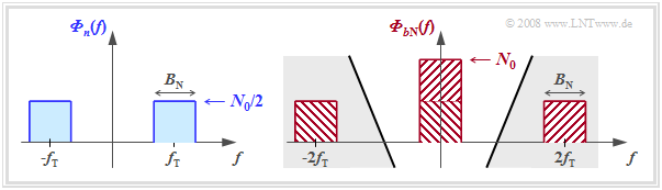 - Während ${\it \Phi}_{n}(f = f_{\rm T}) = N_0/2$ gilt, ist ${\it \Phi}_{b{\rm N}}(f=0) = N_0$.