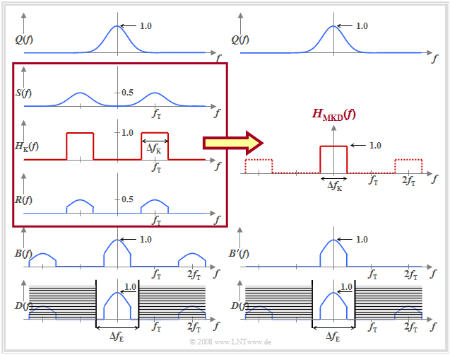 - Man kürzt quasi den Einfluss von Modulator und Demodulator und ersetzt den Bandpasskanal mit dem Frequenzgang $H_{\rm K}(f)$ durch eine geeignete Tiefpass–Übertragungsfunktion $H_{\rm MKD}(f)$, wobei der Index für "Modulator – Kanal – Demodulator" steht.