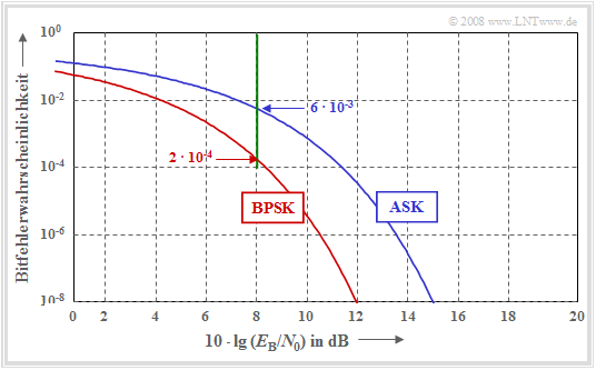 - Für die Fehlerwahrscheinlichkeit $p_{\rm B} = 10^{-8}$ benötigt man bei BPSK etwa $10 \cdot \lg (E_{\rm B}/N_0) = 12 \ \rm dB$, bei ASK dagegen ca. $15 \ \rm dB$.