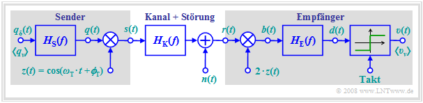 - Unterschiedlich zum Basisbandsystem ist jedoch die Rauschleistung. Der Rauschanteil $b_{\rm N}(t)$ ergibt sich durch die Multiplikation des Bandpassrauschens $n(t)$ mit dem empfangsseiten Träger $z_{\rm E}(t) =2 \cdot \cos(2\pi f t)$ und besitzt die Rauschleistungsdichte