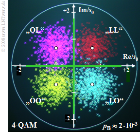 - Der Abstand zu den Entscheiderschwellen ist bei 4–QAM allerdings um den Faktor $\sqrt{2}$ geringer als bei BPSK.