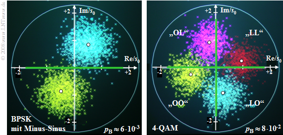 - Die beiden Diagramme unterscheiden sich allein durch die Trägerphase. In beiden Fällen gilt $10 \cdot \lg (E_{\rm B}/N_0) = 6 \ \rm dB$.