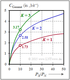 $$C_{\rm Gesamt} = \frac{ K}{2} \cdot {\rm log}_2 \hspace{0.1cm} ( 1 + \frac{P_X}{K \cdot P_N}) \hspace{0.05cm}.$$
