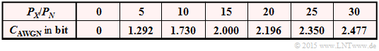$$\Rightarrow \hspace{0.3cm} C_{\rm AWGN}= 1/2 \cdot {\rm log}_2 \hspace{0.1cm} ( 1 + P_X/P_N) \hspace{0.05cm}.$$