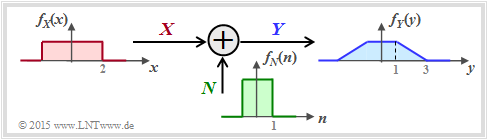 • Das Empfangssignal ist  $Y = X + N$.  Die Ausgangs–WDF  $f_Y(y)$  ist mit der Faltungsoperation  berechenbar   ⇒   $f_Y(y) = f_X(x) ∗ f_N(n)$.
