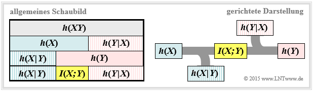 Diese fundamentalen informationstheoretischen Zusammenhänge kann man auch aus der rechten Grafik ablesen.  Diese gerichtete Darstellung ist für Nachrichtenübertragungssysteme besonders geeignet.