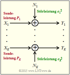 Wir betrachten nun entsprechend der Grafik  $K$  parallele Gaußkanäle von  $X_1 → Y_1$,  ... ,  $X_k → Y_k$,  ... , $X_K → Y_K$.