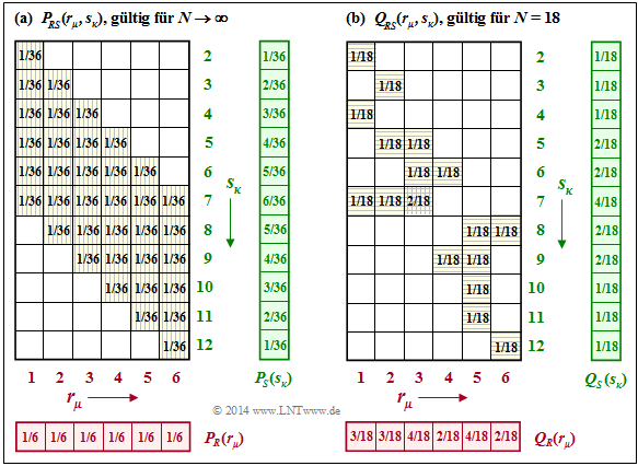 $\text{Beispiel 6:}$ Beim Würfel–Experiment haben wir neben den Größen $R$ (roter Würfel) und $B$ (blauer Würfel) auch die Summe $S = R + B$ betrachtet.