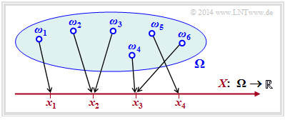- $${\it \Omega} = \{ \omega_1, \omega_2, \omega_3, ... \hspace{0.15cm} \} \hspace{0.25cm} \longmapsto \hspace{0.25cm} X = \{ x_1, \ x_2, \ x_3, \ x_4\} \subset \cal{R}\hspace{0.05cm}.$$