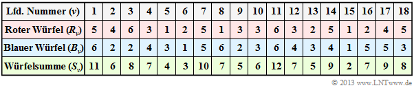 $\text{Beispiel 1:}$ Wir gehen vom Experiment „Würfeln mit zwei Würfeln” aus, wobei beide Würfel an der Farbe unterscheidbar sind. Die Tabelle zeigt als Ergebnis die ersten $N = 18$ Wurfpaare dieses exemplarischen Zufallsexperiments.