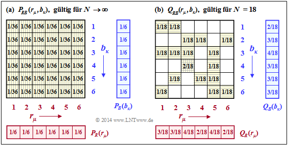 - $$P_{RB}(r_\mu,\ b_\kappa ) ={\rm Pr}\big [(R=r_\mu) \hspace{0.05cm}\cap \hspace{0.05cm} (B=b_\kappa)\big],$$
