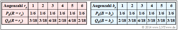 - Die Zufallsgröße $R$ mit PMF $P_R(·)$ gibt die Augenzahl des roten Würfels an und $B$ mit PMF $P_B(·)$ die des blauen.