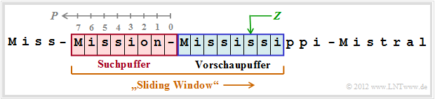 - Gesucht wird nun im Suchpuffer die beste Übereinstimmung ⇒ die Zeichenfolge mit der maximalen Übereinstimmungslänge $L$. Diese ergibt sich für die Position $P = 7$ und die Länge $L = 5$ zu Missi.