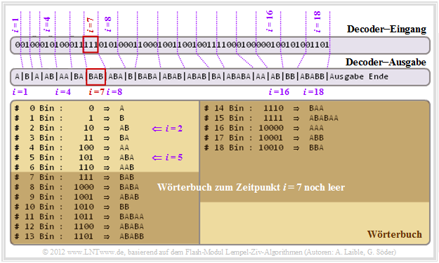 Die Grafik zeigt (mit roter Hinterlegung) das Wörterbuch mit Index $I $ (in Dezimal– und Binärdarstellung, Spalte 1 und 2) und dem entsprechenden Inhalt (Spalte 3), der zum Codierschritt $i $ eingetragen wird (Spalte 4).