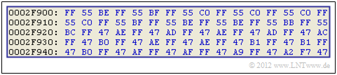 - Man erkennt, dass in diesem kleinen Ausschnitt einer Landschaftsaufnahme die Bytes $\rm FF$, $\rm 55$ und $\rm 47$ sehr häufig auftreten.
