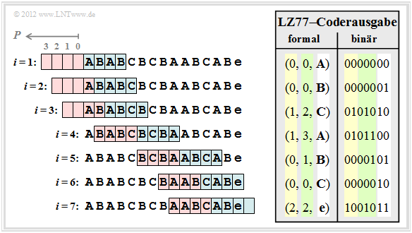 - Die Ausgabe (3, C) in Schritt $\underline{i = 7}$ steht für „WB(3) + C” = ABC und die Ausgabe (3, e) in Schritt $\underline{i = 8}$ für ABe.