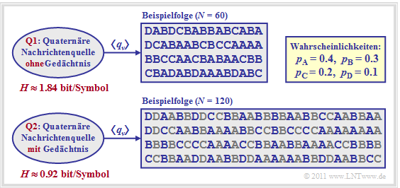 $\text{Beispiel 1:}$ Zu Beginn des ersten Kapitels haben wir eine gedächtnislose Nachrichtenquelle mit dem Symbolvorrat $\rm \{A, \ B, \ C, \ D\}$ ⇒ $M = 4$ betrachtet. Eine beispielhafte Symbolfolge ist in der nachfolgenden Grafik als Quelle $\rm Q1$ nochmals dargestellt.