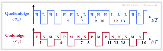 - Dagegen wird $q_ν =\rm H$ alternierend mit $c_ν =\rm P$ und $c_ν =\rm M$ codiert ⇒ Name „Alternate Mark Inversion”.