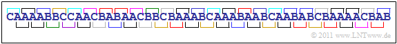 Beachten Sie, dass aus den $50$ Folgenelementen nur $49$ Zweiertupel $(\rm AA$, ... , $\rm CC)$ gebildet werden können, die in der Grafik farblich unterschiedlich markiert sind.