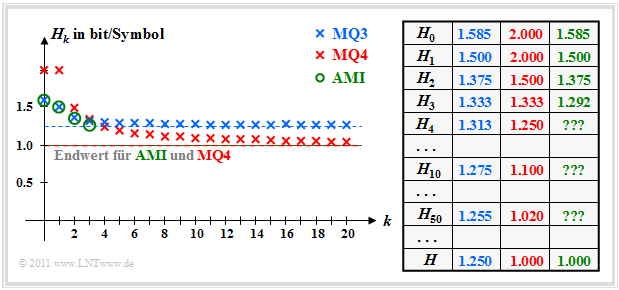 - Die Entropienäherungen $H_1$, $H_2$ und $H_3$ des AMI–Codes (grüne Markierungen) wurden in der Aufgabe A1.4 berechnet. Auf die Berechnung von $H_4$, $H_5$, ... musste aus Aufwandsgründen verzichtet werden. Bekannt ist aber der Endwert von $H_k$ für $k \to \infty$ ⇒ $H = 1.000$.