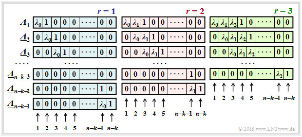- Für jedes $r$ gibt es genau $n-k-r$ Koeffizientenvektoren $\underline {\it \Lambda }_l$, wobei sich $\underline {\it \Lambda }_l$ aus $\underline {\it \Lambda }_{l-1}$ stets durch Rechtsverschiebung um eine Position ergibt. Der Vektor $\underline {\it \Lambda }_{n-k-r}$ endet immer mit einer $1$.