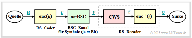 - In diesem Kapitel wird nun der erste Decoderblock als Codewortschätzer $\rm (CWS)$ bezeichnet. Die Namensgebung soll deutlich machen, dass aufgrund des $m$–BSC–Modells Fehlentscheidungen $(\underline {z} \ne \underline {c})$ unvermeidlich sind, nämlich dann, wenn mehrere Symbolfehler das Empfangswort $\underline {y}$ zu einem gültigen Codewort verfälschen.