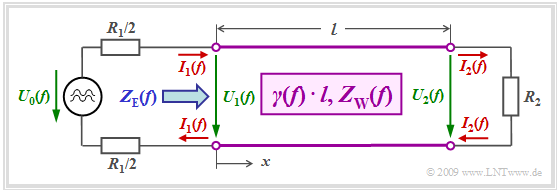 - Der Eingangswiderstand $Z_{\rm E}(f)$ der Leitung aus Sicht der Quelle hängt vom Übertragungsmaß $γ(f)$, der Leitungslänge $l$, dem Wellenwiderstand $Z_{\rm W}(f)$ sowie dem Abschlusswiderstand $R_2$ ab: