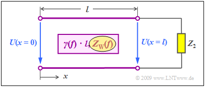 - $$U_{\leftarrow}(x = l) = {U_{\rightarrow}(x = l)}\cdot \frac{Z_2 -Z_{\rm W}(f)}{Z_2 + Z_{\rm W}(f)}\hspace{0.05cm}.$$