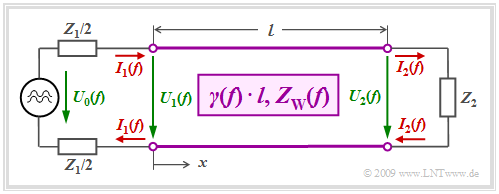 - $$I_{\rightarrow}(x, f) = \frac{U_{\rightarrow}(x, f)}{Z_{\rm W}(f)}\hspace{0.05cm}, $$