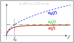 - Für $f \gg f_∗$ gilt $α(f) ≈ α_{\rm I}(f)$, für $f \ll f_∗$ dagegen $α(f) ≈ α_{\rm II}(f)$.