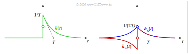 - $$\begin{align*} h_{ {\rm g}}(t) & = {1}/{2}\cdot \big[ h(t) + h(-t) \big]\hspace{0.05cm},\\ h_{ {\rm u}}(t) & = {1}/{2}\cdot \big[ h(t) - h(-t) \big] = h_{ {\rm g}}(t) \cdot {\rm sign}(t)\hspace{0.05cm} .\end{align*}$$