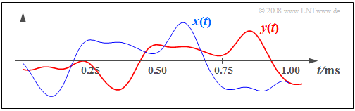 $\text{Beispiel 1:}$ Die folgende Grafik zeigt das Eingangssignal $x(t)$ und das Ausgangssignal $y(t)$ eines zwar nicht idealen, aber verzerrungsfreien Systems. Die Systemparameter sind $α = 0.8$ und $τ = 0.25 \ \rm ms$.