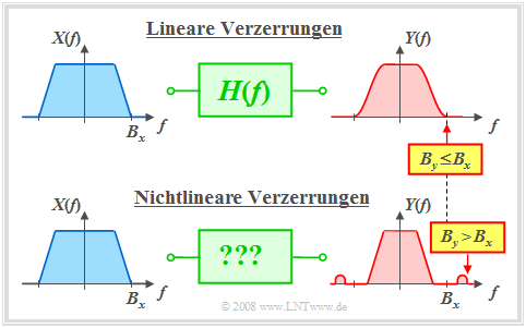 $\text{Fazit:}$ Die Unterschiede zwischen linearen und nichtlinearen Verzerrungen sollen anhand einses Schaubildes verdeutlicht werden: